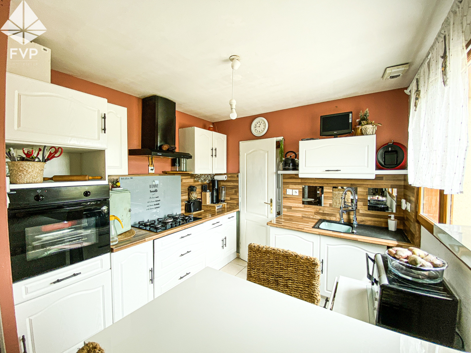Cuisine A+E, sol carrelage, 1 fenêtre expo Sud, accès arrière cuisine