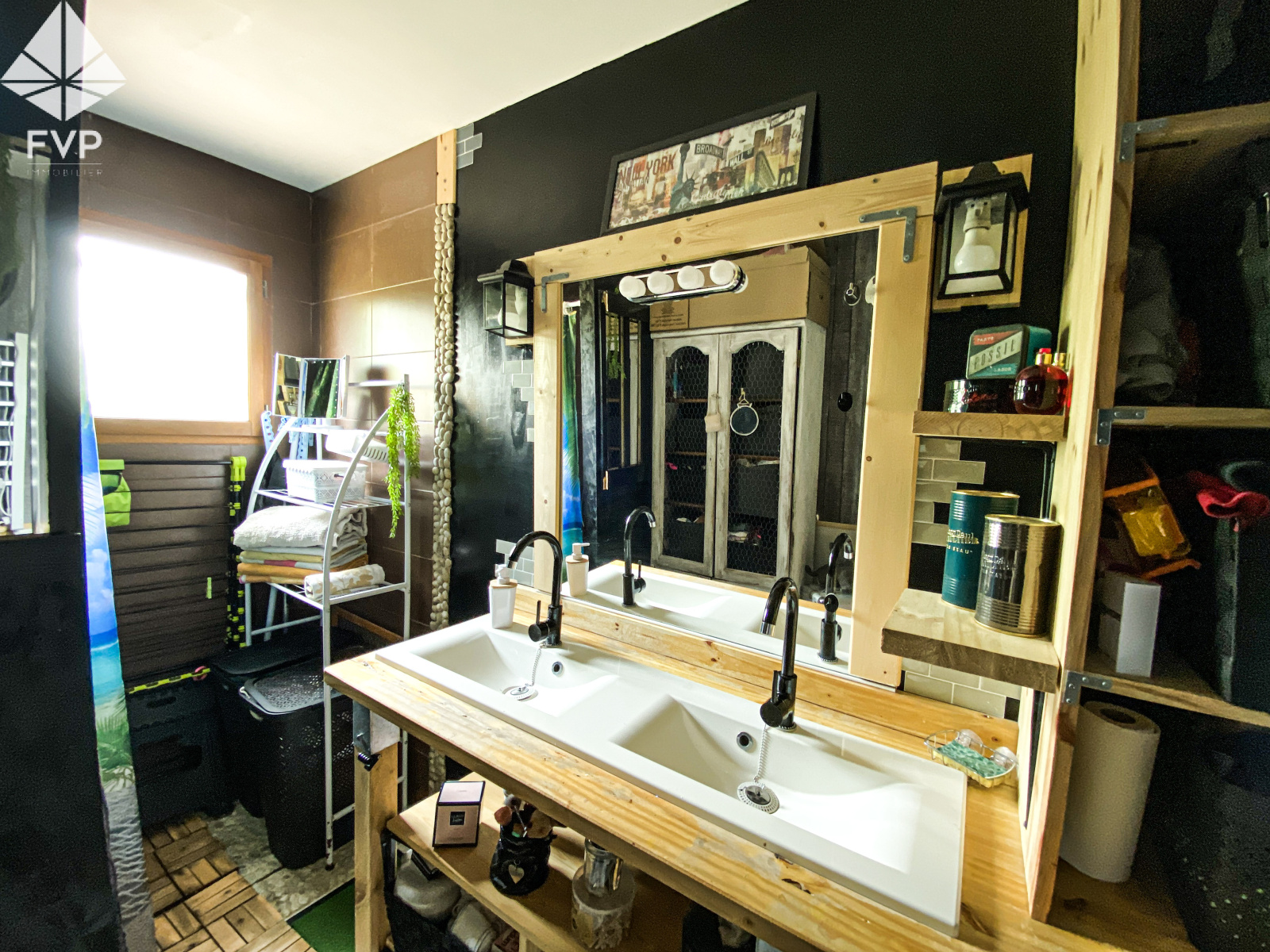 1 meuble double vasque, 1 douche cabine, 1 fenêtre expo Nord