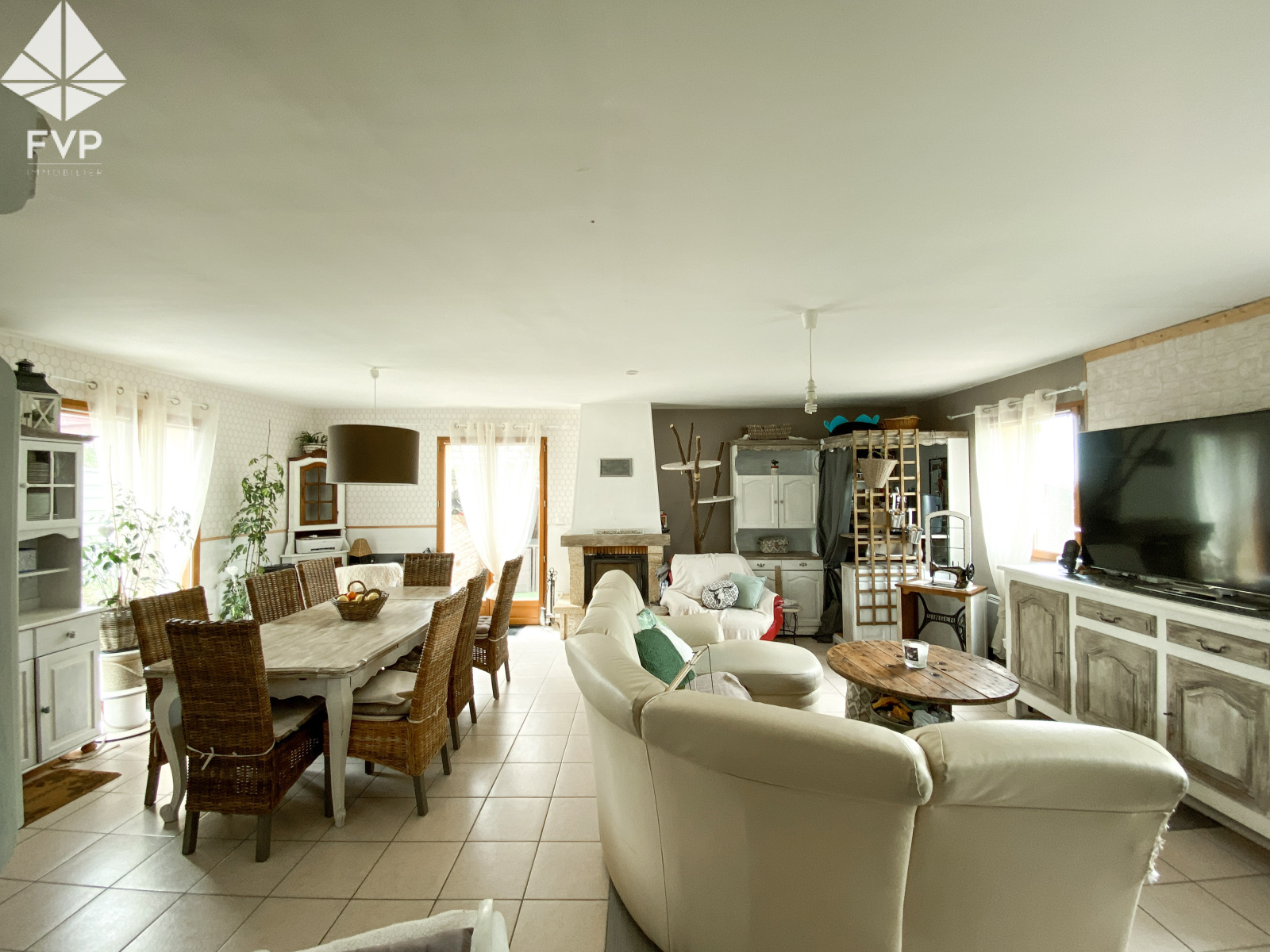 S2jour salon avec cheminée insert, sol carrelage, 1 porte fenêtre expo Sud, 1 porte fenêtre expo Ouest, 2 fenêtres expo Nord