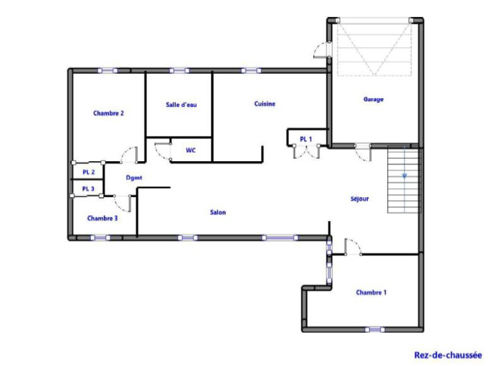 Au rez-de-chaussée, un vaste séjour/salon d'environ 44m², une cuisisne aménagée et équipée semi-ouverte sur le séjour avec un accès sur l'exterieur, trois chambres avec placards, une salle de bains et des WC séparés;