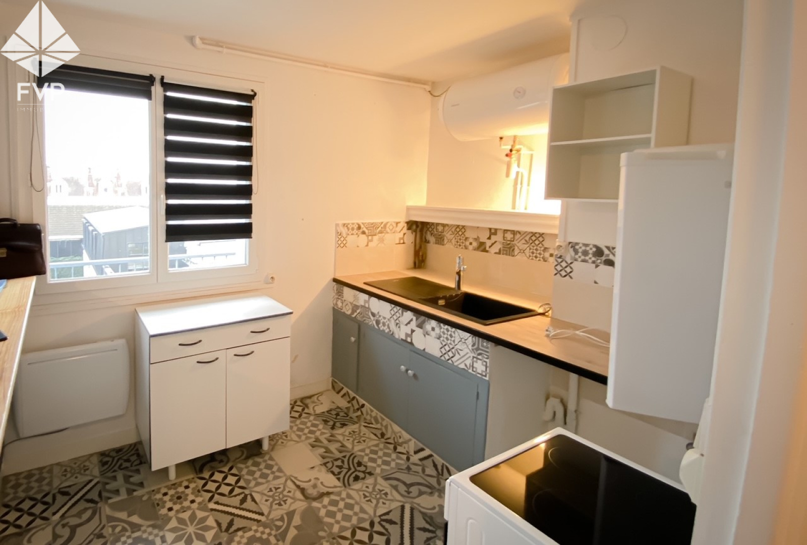 Coin cuisine avec evier + meuble sous-évier. Ouverture passe-plat avec comptoir vers séjour