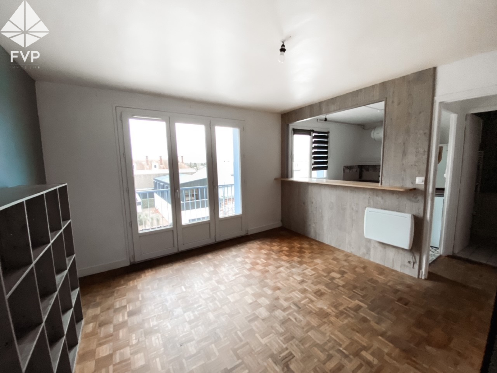 Séjour sol parquet bois avec accès balcon