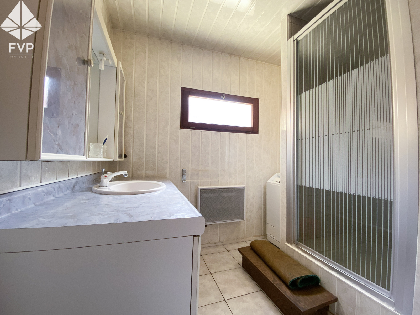 Un meuble simple vasque, 1 douche cabine, 1 placard avec cumulus, 1 fenêtre Sud Est