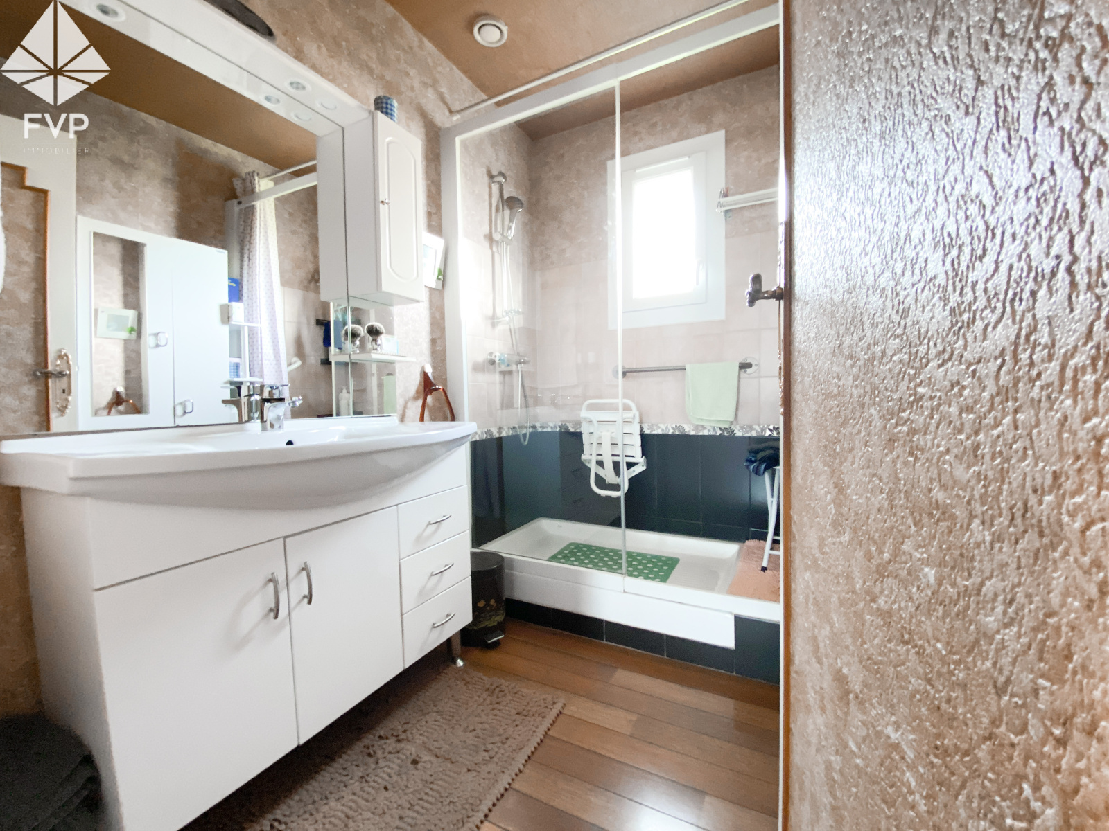 1 meuble sous lavabo, 1 douche à l'italienne, 1 fenêtre expo N-E